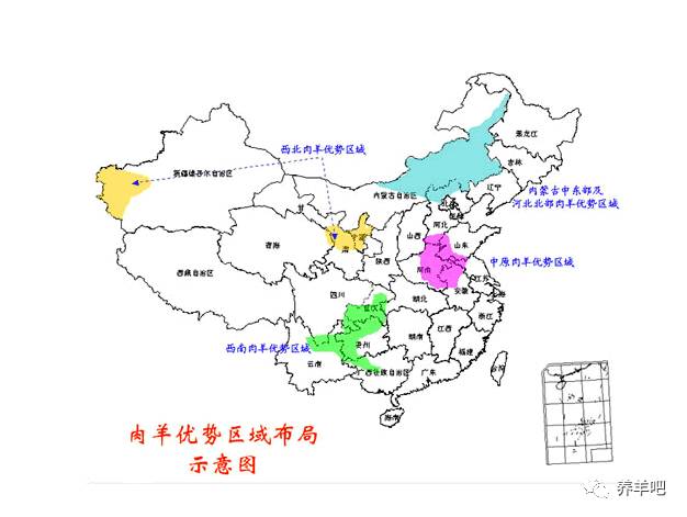 我国各地区饲草饲料资源、畜禽品种资源、地域环境、气候等自然资源和社会发展以及科技进步水平不同,我国肉羊规模饲养也呈现出显著的区域差异。农业部根据资源优势、产业优势、增长优势和集中连片的原则确定了四大肉羊优势区域,即中原肉羊优势区、中东部农牧交错带肉羊优势区、西北肉羊优势区和西南肉羊优势区。其中西北主要为天然饲草羊(以乌珠穆肥羊和小尾寒羊为主);西南肉羊以饲料养殖的山羊为主,中原区为养殖的饲料羊为主,中东部以养殖的小尾羊和湖羊为主。总之,我国养殖羊地区广泛,有缓冲的空间。