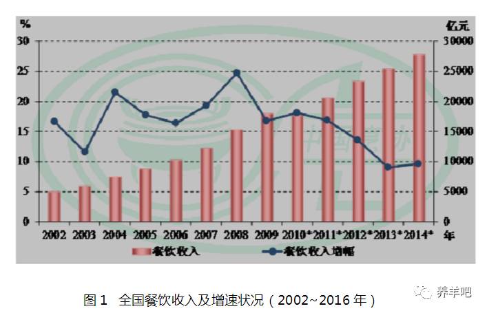 笔者认为,从餐饮业维度分析解释“羊白劳”现象。从2013年起,餐饮低迷,高端消费明显断崖式式下降,餐饮行业减速,订单减少,国内羊肉尤其是优质高端羊肉也受到冲击。(见图1)