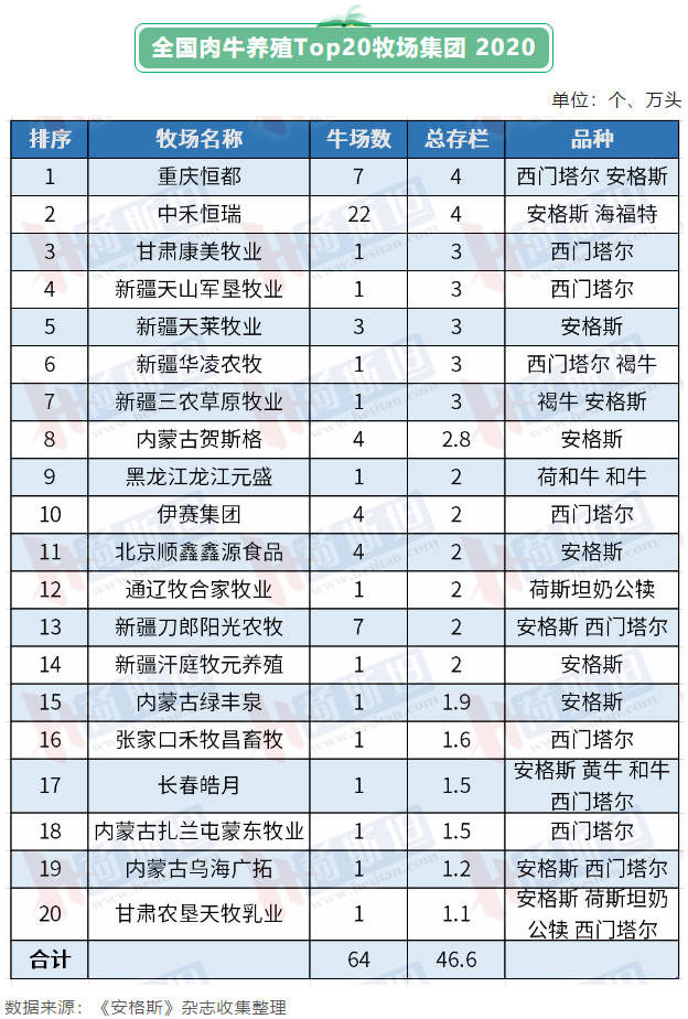 2020年中国存栏最多的20个规模牧场主要分布在西南、西北以及东北三处,总存栏46.6万头,分布在64个牧场中。其中西南地区2个牧业集团8万头,西北地区15个牧业集团15万头(包括内蒙),东北地区2个牧业集团3.5万头。
